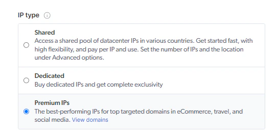 当您使用高级IP时,您的请求将通过已知成功率最高的IP地址进行无缝路由,这些IP都是最适合您的地理位置和域名需求的。只需在数据中心代理区域的配置中选择高级IP即可: