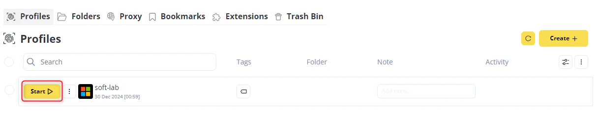 2. 点击 Create 以开始配置新的浏览器配置文件。