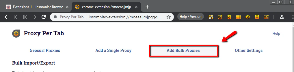 - 在Insomniac的Proxy per tab扩展程序中,进入管理代理列表,然后选择批量添加代理