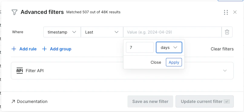 Example Use Case: Suppose you want to filter records to include only those from the last 7 days. You can use the “Last” expression to retrieve all records from the past week while excluding older data.