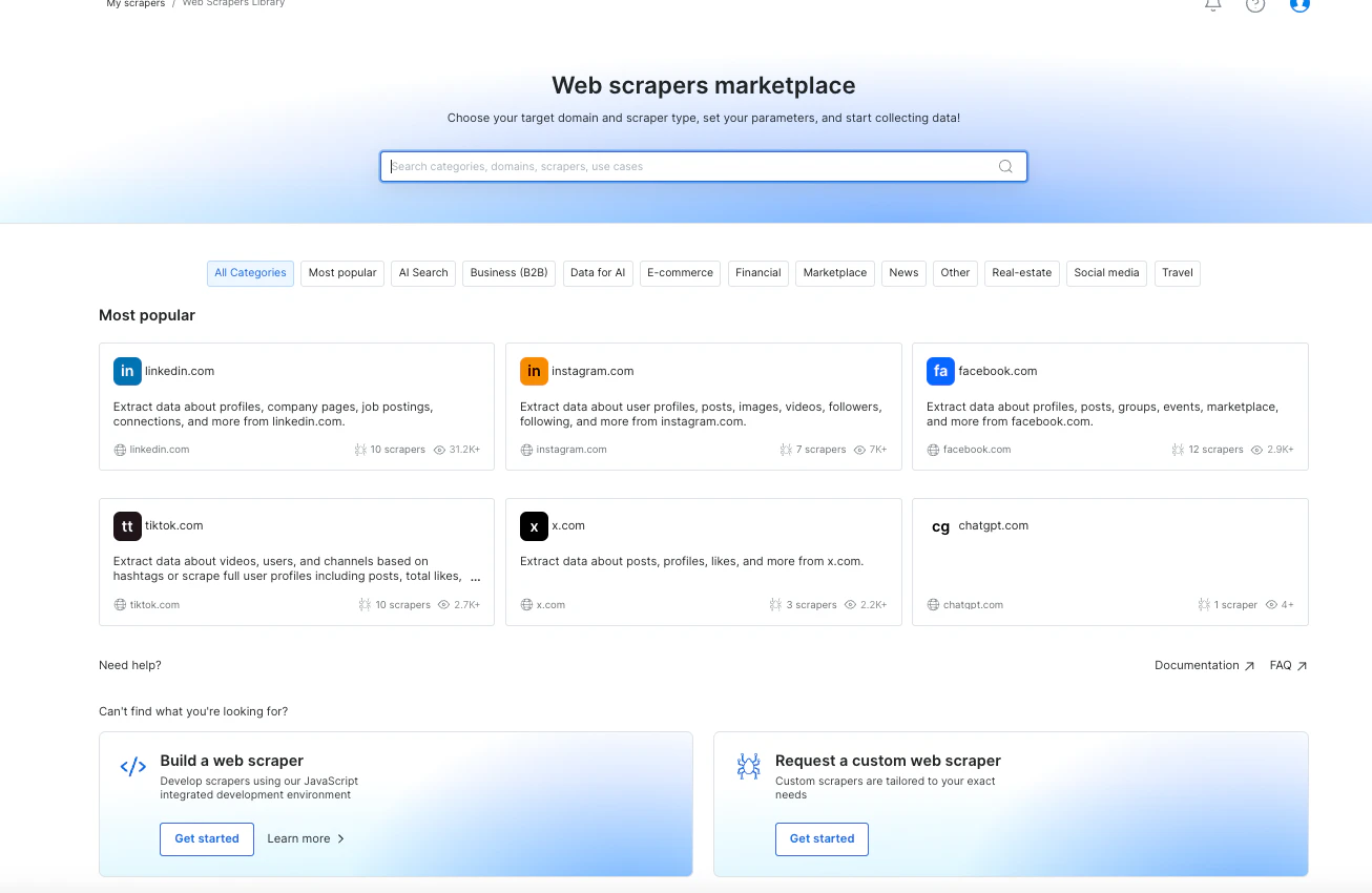 - Custom scrapers - Allows users to request a custom scraper if the domain is unavailable in our marketplace. Just supply 2 URLs to get the process started - see the video!