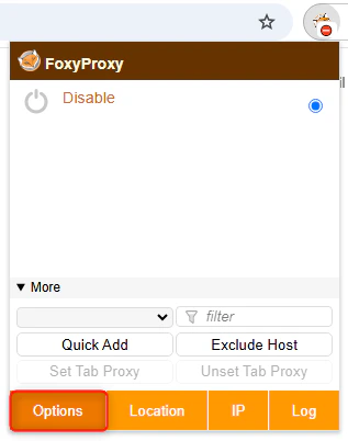 - Click on the FoxyProxy icon in the toolbar and choose Options from the dropdown menu.