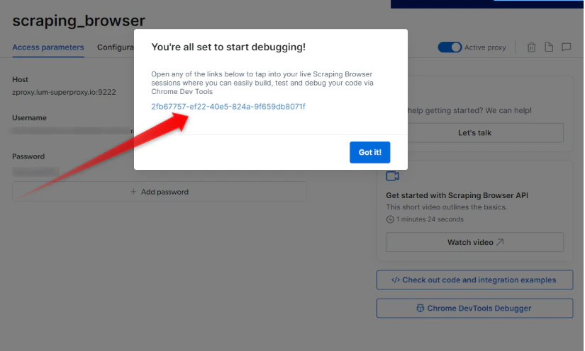 - Click on the Debugger button within your ‘Access parameters’ tab to launch the Scraping Browser Debugger interface (see the screenshot above )