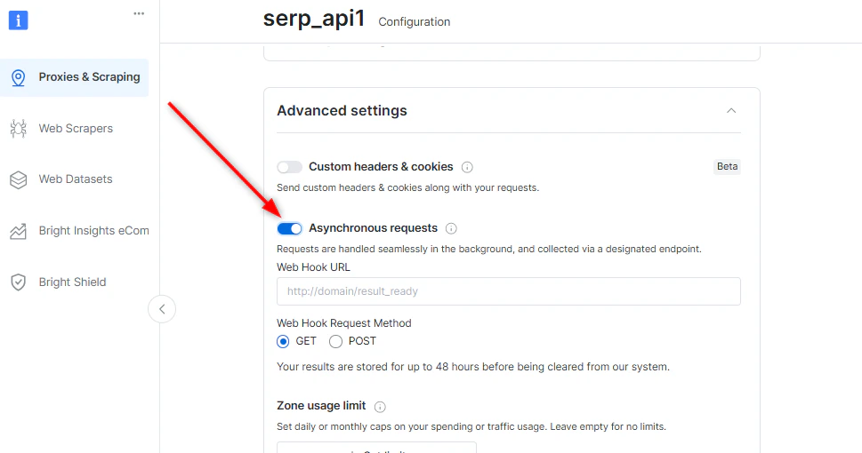 Within your specific Web Unlocker or SERP API zone, under “Advanced settings”, enable the “Asynchronous requests” toggle.