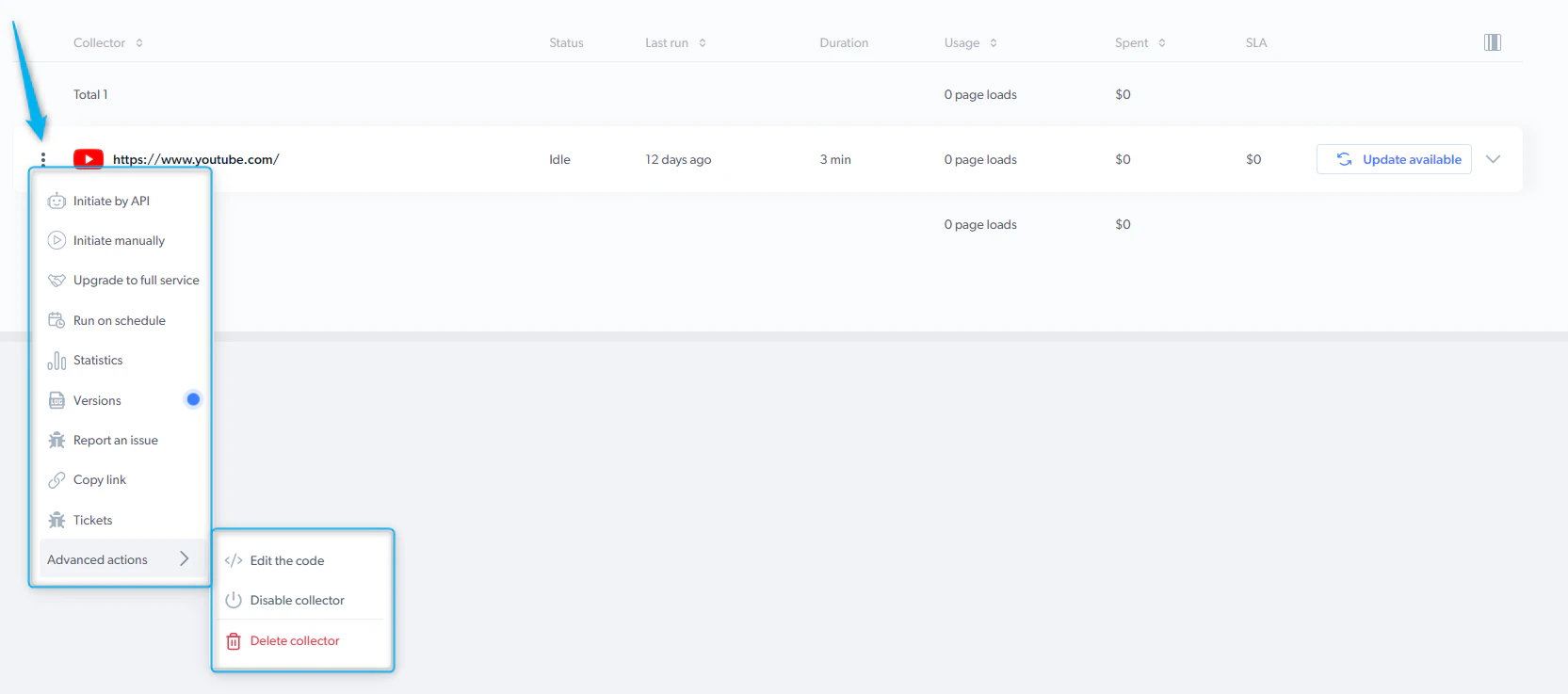 The scraper action menu allows performing different actions with the scraper.- Initiate by API - start a data collection without having to enter the control panel