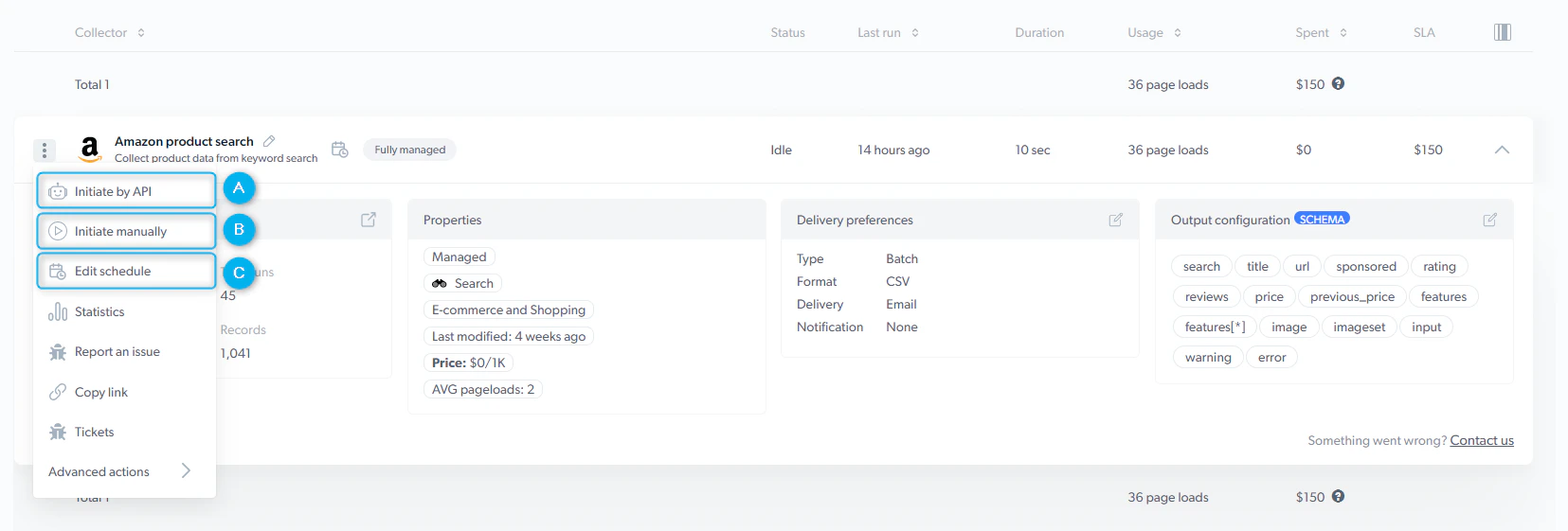 Initiate scraper To start collecting the data, you have three options: A. Initiate by API B. Initiate manually C. Schedule a scraper