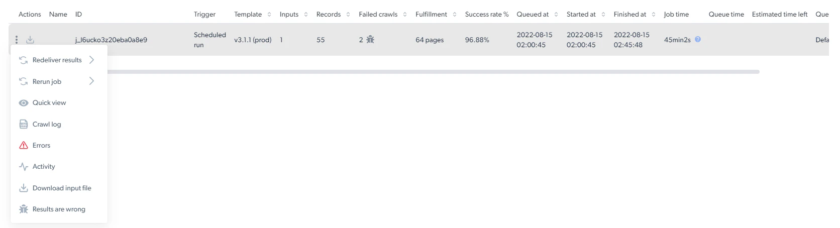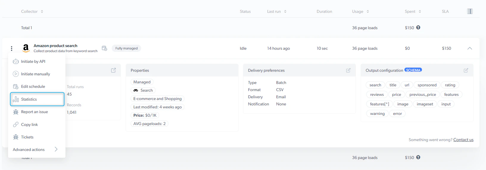 - 3 dots Here you can perform different functions with the data collection job: The statistics page presents essential information about the success of the data collection. Below is a list of all the terms included in the statistics table: